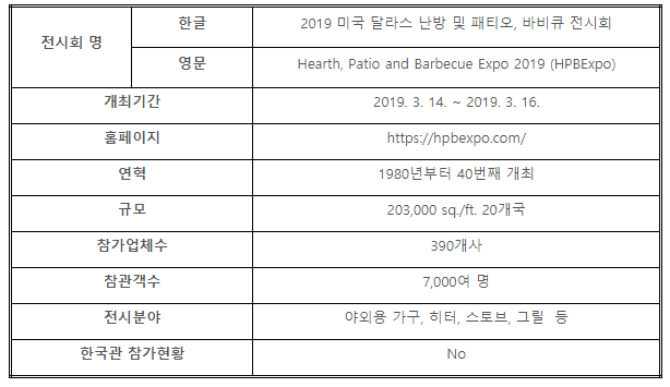 미국 달라스 난방 및 패티오 , 바비큐 전시회는 미국 최대 실내-야외 생활 전시회로 매년 패티오, 바비큐, 그릴 등의 아웃도어 활동 및 가정용 난방 솔루션을 전시하고 시연한다. 그릴, 그릴 액세서리 및 실외 주방, 패티오 가구 및 옥외 장식품 등 최신 관련 기술과 서비스를 찾을 수 있는 원스톱 장소이다. 2019년 3월 14일에서 16일, 텍사스 주 달라스에서 개최되었으며, 2020년에는 3월 11일에서 14일까지 루이지애나 주의 뉴올리언즈에서 개최될 예정이다.