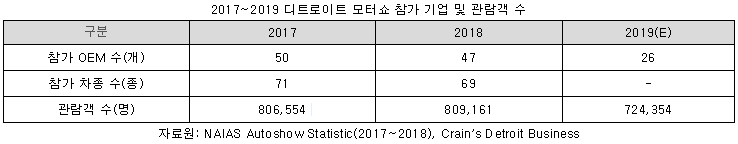 - 2019년 디트로이트 모터쇼는 다수 유럽 브랜드가 불참을 선언해 개최 전부터 우려의 목소리가 컸으며 실제로 예년에 비해 관람객이 줄어들었음.