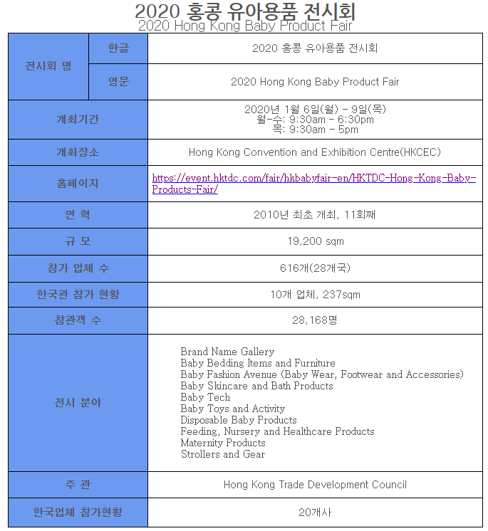 2020년 1월 6일부터 9일까지 홍콩전시컨벤션센터(HKCEC)에서 2020 홍콩 유아용품 전시회가 성황리에 개최되었다.