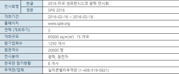 SPIE(The International Society for Optical Engineering)에서 주관하는 Photonics West(이하 서부 광학전시회)는 북미에서 광학관련 가장 큰 규모를 자랑하는 전시 행사이며 매년 2월경 샌프란시스코에 위치한 모스코니 센터에서 열린다. 전 세계 1,250여개의 기업들이 3일간 전시를 진행하며 약 20,000명 이상의 참관자(바이어)들이 참여를 하여 많은 거래가 이루어지기도 하는 광학 전문 행사이다. 주요 전시 품목으로는 광학 렌즈, 광통신 관련, LED 등이 있으며 이 품목들은 주로 의료용, 자동차, 모바일 등 다양하게 쓰이게 된다.