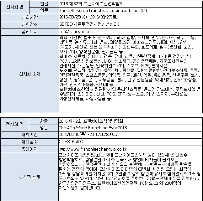 ○ 동 전시회는 개별 창업자를 위해 정보를 제공하고 창업 관련 구인, 구직 지원하여 프랜차이즈 산업 활성화 및 유관 관련 산업의 생산성 증대 기여하고 있습니다.