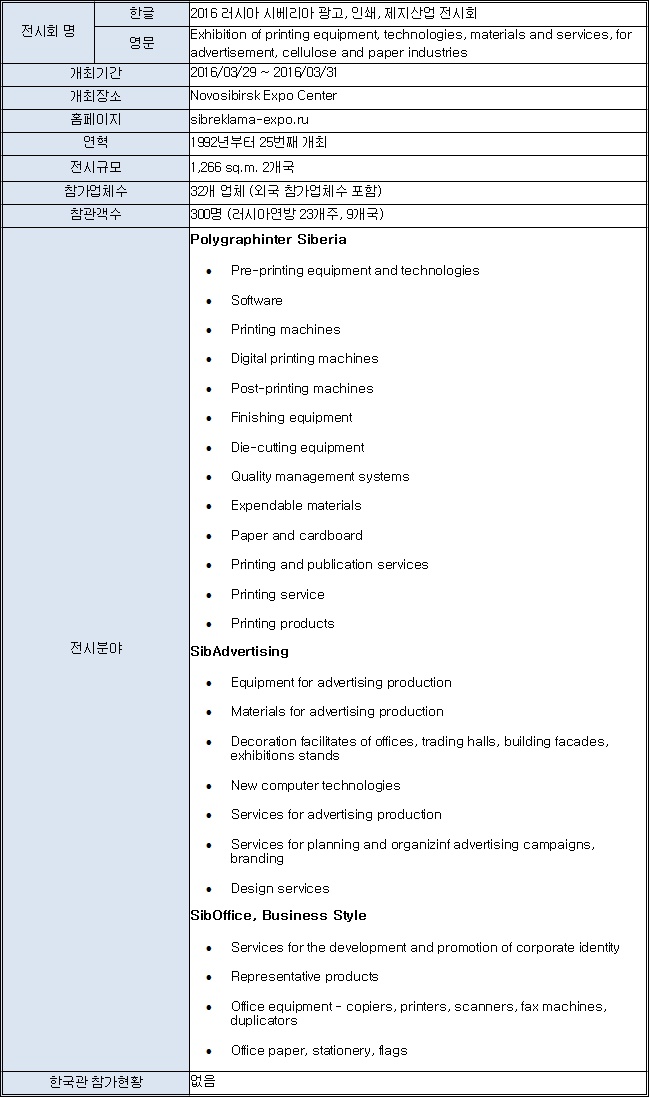 ○ 2016년 3월 29일부터 31일에는 2016 Mashex Siberia 전시회와 2016 러시아 시베리아 프랜차이즈 전시회, 2016 러시아 시베리아 광고Ÿ인쇄Ÿ제지산업 전시회가 동시에 열렸습니다. 노보시비르스크 엑스포센터 1층 A홀 전체를 2016 Mashex Siberia 전시회가 사용했으며, 1층 B홀은 2016 러시아 시베리아 프랜차이즈 전시회, 2016 러시아 시베리아 광고Ÿ인쇄Ÿ제지산업 전시회가 함께 사용했습니다.
