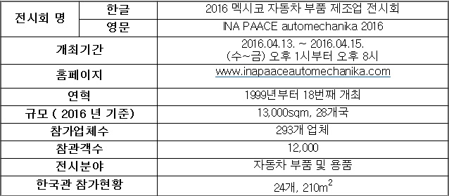 ○ 멕시코 최대 자동차 부품 관련 전시회 ‘INA PAACE automechanika 2016’이 4월 13~15일까지 3일간 멕시코시티 Centro