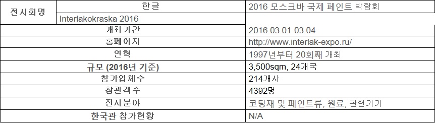 Interlakokraska는 국제 박람회이며 세계 페인트업계를 선도하는 행사임. 이 박람회는 러시아 연방 상공업부, 모스크바 시정부, 모스크바 상공업부, 러시아 화학연구 연합의 지원을 받고 러시아 산업무역부, 산업가 및 경영가 연합, 멘델레예프 러시아 화학연구회, 모스크바 화학산업기구 등의 협조를 받아 개최됨.