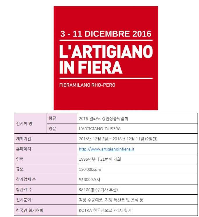 ○ 제 21회 이탈리아 밀라노 장인상품박람회 (L’ARTIGIANO IN FIERA)가 지난 2016년 12월 3일부터 12월 11일까지 총 9일간 Rho Fieramilano 전시장에서 개최됐다.