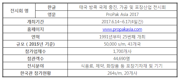 ㅇ 2017년 제25회를 맞은 동 전시회는 포장산업 관련 아시아 최대 규모의 전시회로 자리잡음.