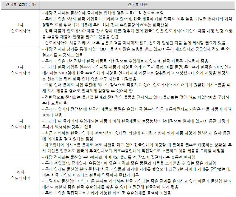 ㅇ 한국관에 방문한 바이어 4개 업체와 실제로 해당 전시회에 어떻게 생각하는지, 전시회 참가 이후의 사업 계획 및 인도네시아 물산업 비즈니스 노하우에 대한 조언을 얻기 위해 KOTRA 자카르타 무역관에서 자체적으로 인터뷰를 진행했으며, 인터뷰 내용은 다음과 같음.