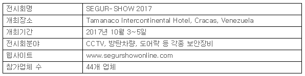 현재 베네수엘라의 경제사정 악화로 범죄가 늘어나는 추세임. 이를 막기 위해 보안시장이 크게 성장하고 있으며, 차량도난, 건물침입 등을 지키기 위한 CCTV시장이 가장 크게 성장함. 그 이외에도 차량용 방탄유리, 방탄복 등 범죄상황에서 도움이 될 만한 제품이 많이 등장했으며 경제 상황이 호전될 경우라도 타국에 비해 범죄율이 높기 때문에 꾸준히 성장할 것으로 보임.
