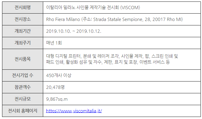 - 제 33회 이탈리아 밀라노 사인물 제작기술 전시회 (이하 VISCOM)이 밀라노 로피에라 전시장에서 지난 10월 10일부터 12일까지 3일