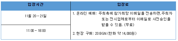 - 동 전시회는 11월 20일부터 21일까지 양일간 진행되었으며, 입장 시간 및 요금은 다음과 같음. 표 하나로 2,3,4번홀 모두 입장이 가능했음.