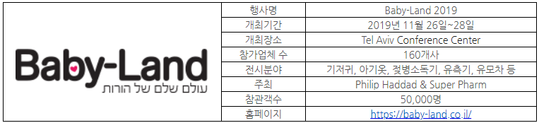 - Baby-Land는 매해 텔아비브에서 개최되며, 올해로 12회차를 맞이하는 이스라엘에 유일한 영 유아용품 관련 전시회에 해당한다.