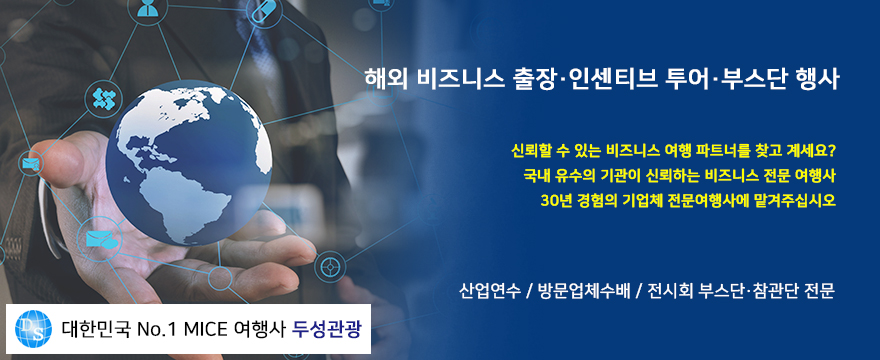 신청절차 ■ 신청마감 : 출발 3주전까지 여권사본과 참가신청을 보내주셔야 합니다. (항공사 명단 3주전 마감 / 일부단체제외) ■ 신청방법 : 신청서를 작성하신 후 메일 또는 FAX로 보내주시고, 1人 신청금 (미주/유럽 50만원, 기타 지역 30만원) 입금 ■ 입금계좌 : 신한은행 140-001-014282 / 예금주 : 두성관광 (회사명으로 입금바랍니다) 기타안내 ■ 단체행사(10인 이상), 소그룹(4-8인), 개별출발, 업체방문 및 시장조사 등 개별행사 가능합니다. ■ 상기 일정은 항공과 현지 사정에 따라 변동될 수 있습니다. ■ 당사는 가이드, 기사 팁 등 일체의 잡비를 걷지 않습니다. ■ 전시회의 개최일 변경, 출품품목 등은 해당 사이트에서 직접 확인하시기 바라며, 이에 대한 (주)두성관광의 책임은 없습니다. |