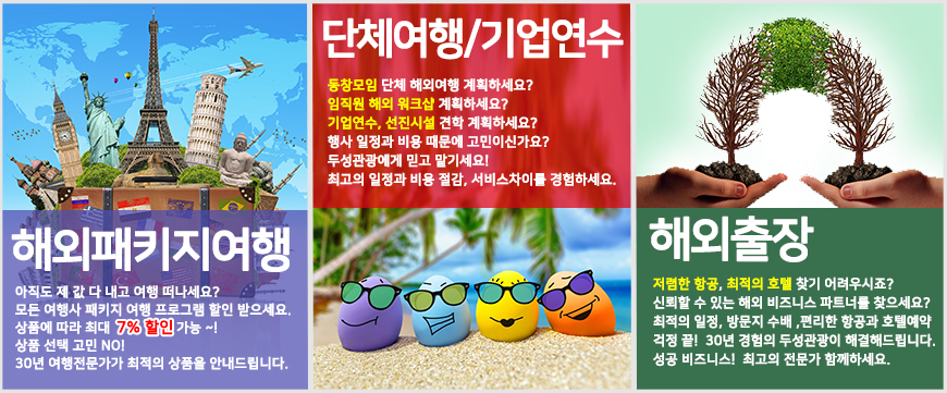 신청절차 ■ 신청마감 : 출발 3주전까지 여권사본과 참가신청을 보내주셔야 합니다. (항공사 명단 3주전 마감 / 일부단체제외) ■ 신청방법 : 신청서를 작성하신 후 메일 또는 FAX로 보내주시고, 1人 신청금 (미주/유럽 50만원, 기타 지역 30만원) 입금 ■ 입금계좌 : 신한은행 140-001-014282 / 예금주 : 두성관광 (회사명으로 입금바랍니다) 기타안내 ■ 단체행사(10인 이상), 소그룹(4-8인), 개별출발, 업체방문 및 시장조사 등 개별행사 가능합니다. ■ 상기 일정은 항공과 현지 사정에 따라 변동될 수 있습니다. ■ 당사는 가이드, 기사 팁 등 일체의 잡비를 걷지 않습니다. ■ 전시회의 개최일 변경, 출품품목 등은 해당 사이트에서 직접 확인하시기 바라며, 이에 대한 (주)두성관광의 책임은 없습니다. |