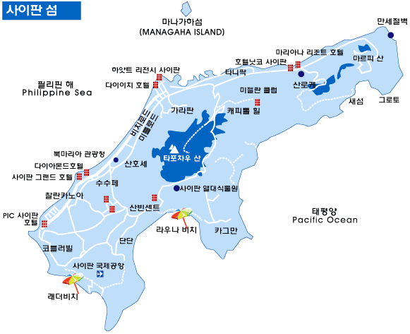사이판은 남북 길이 약 21킬로미터, 동서 길이 약 8.8킬로미터의 매우 작은 섬이다. 산호초가 바다 위로 솟아오르면서 형성된 섬으로, 에메랄드 바다로 둘러싸인 주변 풍광이 무척 아름답다.