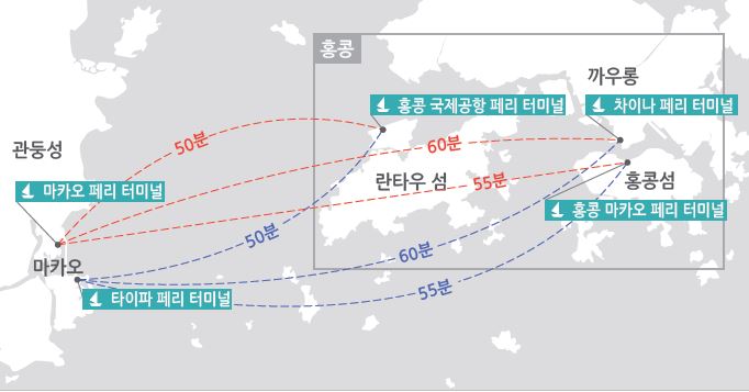 - 홍콩 시내 셩완과 침사추이 페리 터미널에서 마카오 반도와 타이파 섬에 페리가 연결된다.