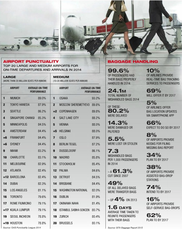 2014년 전세계 공항의 정시 운항률이 발표되었습니다. 승객 규모 2천만명을 기준으로 대형과 중형공항으로 구분 조사하였습니다. 전세계에서 정시운항률이 가장 높았던 공항은 루프트한자 독일항공의 허브이기도한 독일의 뮌헨공항입니다. 이어서 도쿄 하네다, 시애틀 타코마, 싱가폴 창이, 미국 미니애나폴리스, 네덜란드 암스테르담, 독일 프랑크푸르트, 호주 시드니, 미국 마이애미입니다. 인천공항은 정시운항률 78.8%을 기록하여 19위에 랭크되었습니다.